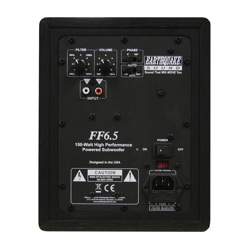 Earthquake’s FF 6.5″ Powered Subwoofer system was designed to offer consumers budget and volume optimized subwoofer system solutions. This range is a perfect choice to use with budget home theater installs. With built-in 150-Watt Class “A/B” high efficiency power amplifier, auto signal sensing, 0 – 180° phase shift and 40 – 180Hz crossover, the FF6.5 is your go to sub when both budget and space are limited, but don’t let its price nor size fool you, this small 6.5″ Powered Subwoofer can produce over 100dB peak SPL (includes room gain) from 40Hz to 135Hz which a very powerful. Big Bang For a Small Price. Special Features Front firing design with small footprint Transmission line construction and single slot port for optimized bass output Single Slot Port for optimized bass output Built in 150-Watt Class “A/B” high efficiency power amplifier 12dB/Octave variable filter from 40 Hz to 180 Hz Automatic signal detection circuitry – automatically turns on the subwoofer ON/OFF Status LED indicators Low level (RCA) audio inputs 6.5″ high power subwoofer 0 – 180° phase shift Also available in 10″ and 12″ models Specifications Amplifier Power: 150 Watts Frequency Response: 25 – 180Hz Weight: 16.5 lbs Finish: Black Ash
