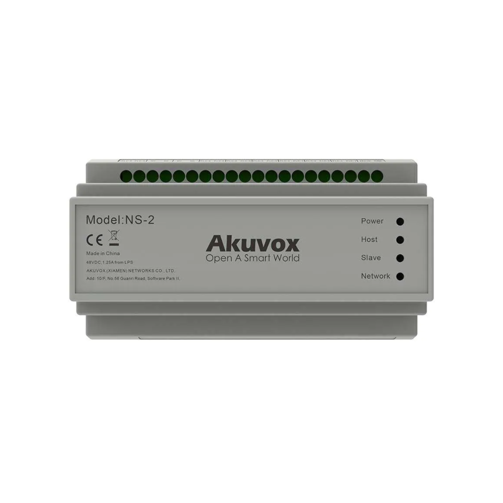 Akuvox NS-2 2-Wire IP Network Distributor Switch – Supports Up to 6* Akuvox 2-Wire Intercom Devices – Supports DINRAIL Mount Key Features :- Support network and power supply for R20A-2 or C313W-2 through 2-wire cable Support multi-level cascade through 2-wire cable Connects up to 6 pcs of Akuvox 2-wire IP intercom devices Super long transmission distance via 2-wire cable Powered by 48VDC or 24VDC power supply unit Rail mounting installation Akuvox Product-Link