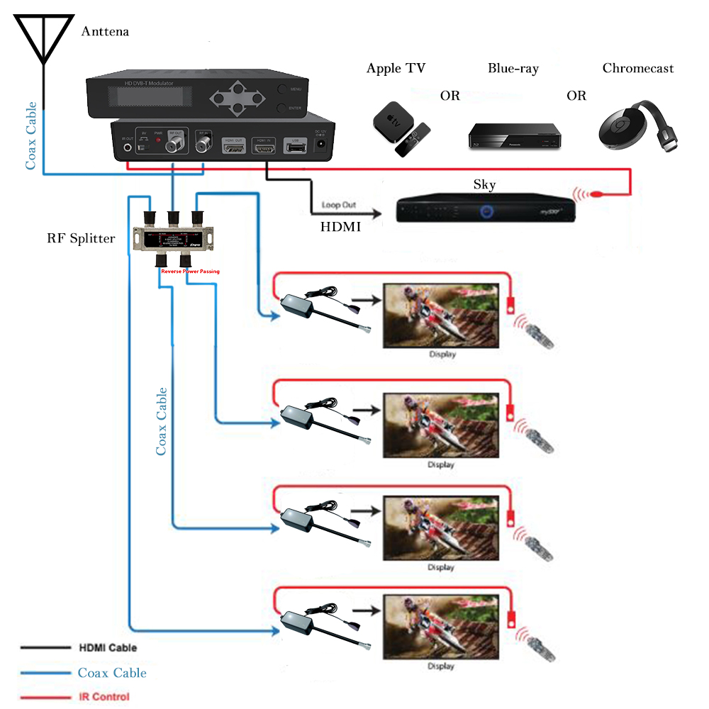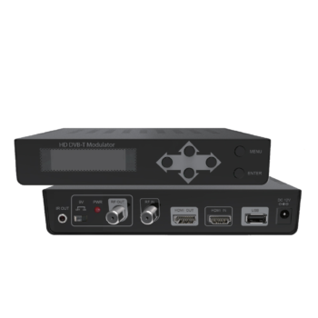 Digital Modulator DVB-T With IR Return Path (ARC-HDM-IR) – Arco The Digital Modulator DVB-T is able to generate a signal in DVB-T format (Digital Terrestrial Television) from HDMI input. It is an H264 encoding, DVB-T modulation integrated device to convert HDMI signal to DVB-T RF out. It has been equipped with one channel HDMI input, one HDMI out(HDMI pass-through), and one DVB-T RF out. The Digital Modulator DVB-T adjusts the compression rate to the available bandwidth, using the modulation DVB-T parameters. It converts HDMI signal to DVB-T RF out with IR return path to allow channel changing from other rooms. Able to control remote control signals easily from coaxial cable. Long transmission distance and Simple Plug-and-Play installation What’s in the Box One DVB-T Modulator with IR return path One power adaptor One IR Emitter Specifications Input Channel 1 Video HDMI Video System 480i/p, 576i/p, 720p, 1080i/p Audio system HDMI Connections HDMI IN HDMI IN HDMI OUT HDMI PASS THROUGH RF Output (9VDC) RF outputs ( providing accessory power supply 9 volts DC for IR Pass) DC Switch Power supply 9 volts DC for IR Pass RF Input RF Combiner USB Firmware upgrade IR Out IR Emitter output **IR Receiving Eye Sold Separately