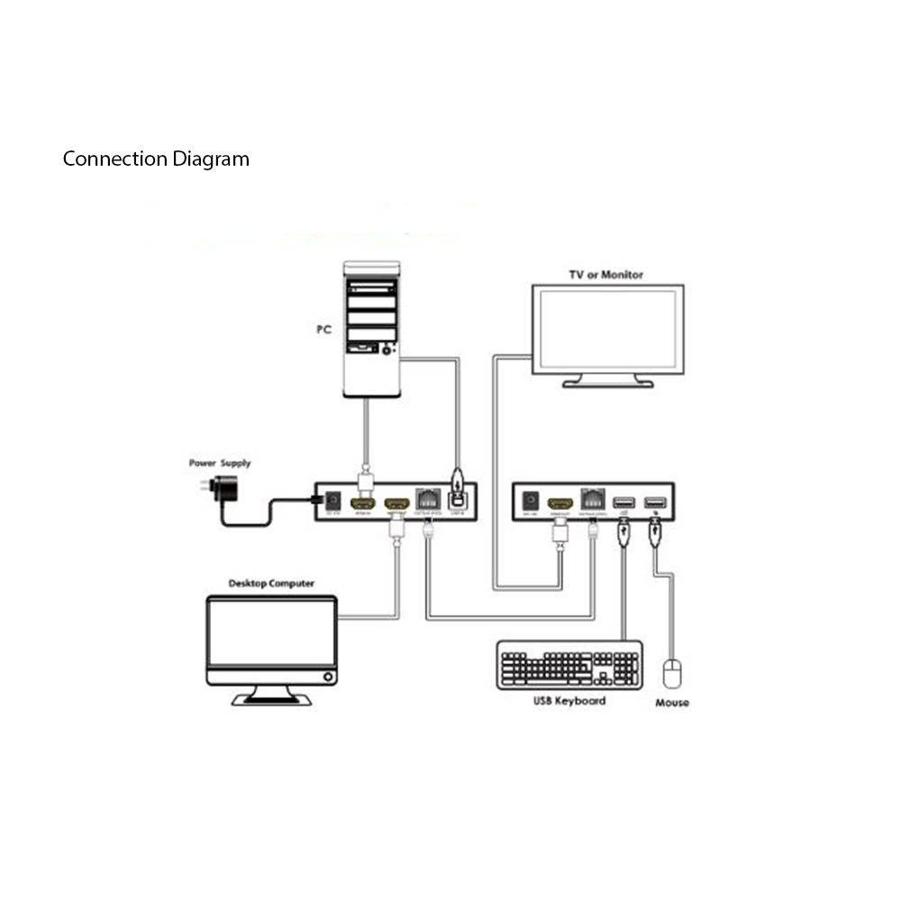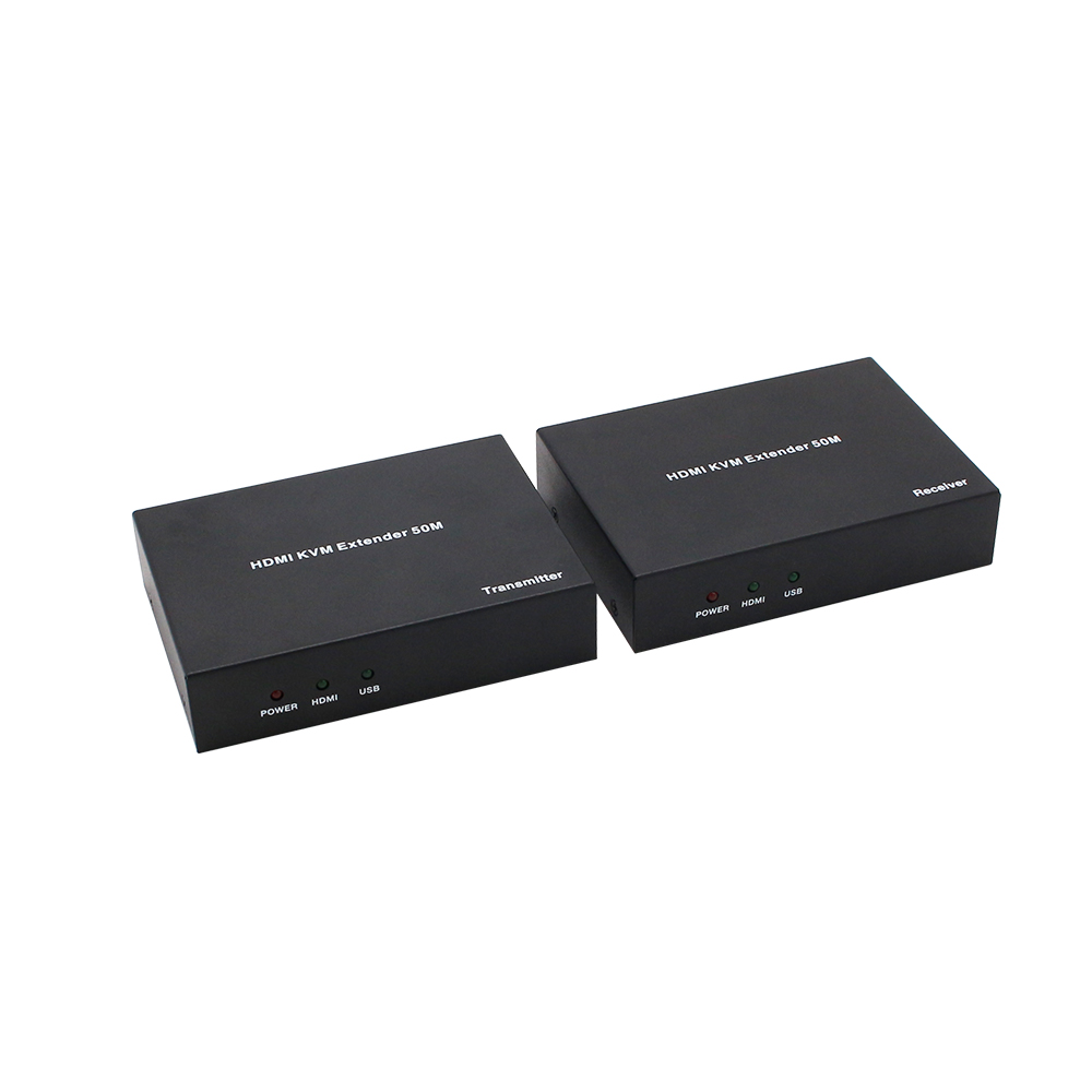 HDMI USB KVM Extender over 50m The HDMI/USB KVM Extender can extend high definition HDMI and USB signals up to 164ft/50m over a single Cat5e/6 cable with zero latency. It supports HDMI 1.4b and USB 2.0 standards. Two-way POC (Power over Cable) function allows either TX or RX be powered by a single 12V@1A power supply. It’s an ideal product for cyber bar and KVM extender markets.