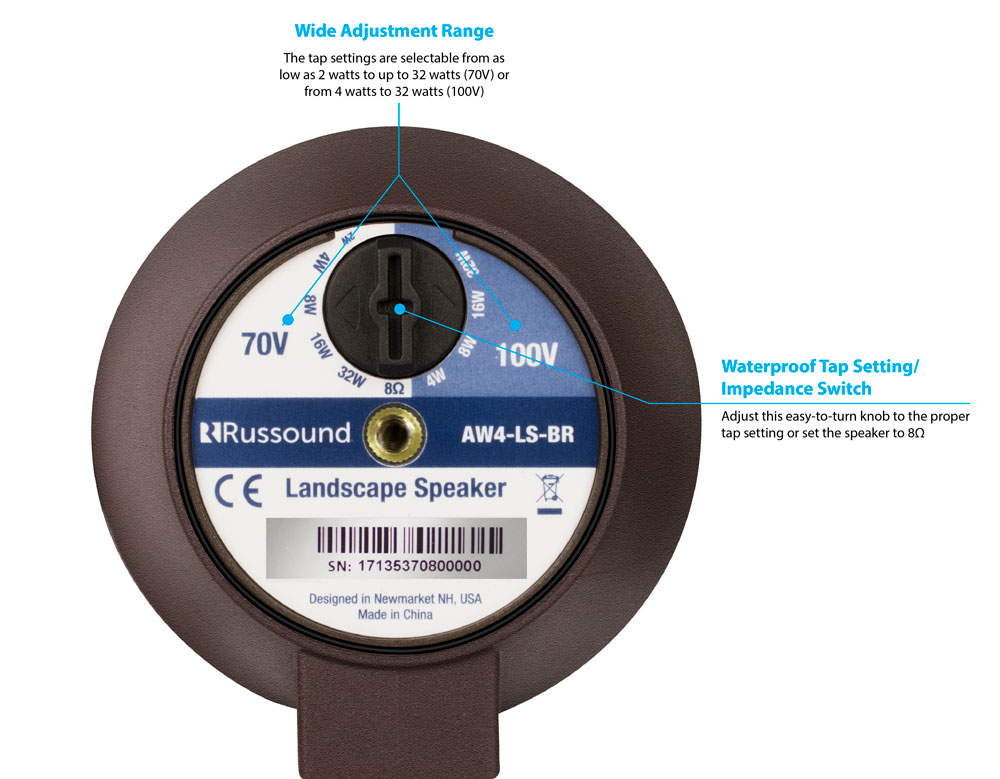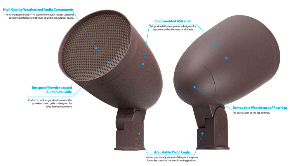 The AW4-LS-BR loudspeaker offers an elegant, scalable platform for providing high quality audio to any outdoor area in even the harshest environmental conditions. Specially designed to withstand both extreme heat and cold, the speakers work great from the humid, hot conditions of summertime to the bone-chilling cold of winter. The key component of the Russound landscape audio system is the AW6-LS-BR, a 6” 2-way design satellite speaker that can be mounted anywhere in an outdoor space, from ground level to the treetops. Its small profile and subtle coloring allow it to blend into your landscape design while its high-quality audio complement can add a new dimension of sound to your outdoor living space and bring your favorite music to your backyard, patio, pool, or lanai. Features Designed for excellent sonic performance in any outdoor space Rust-proof aluminum grille and color-molded composite construction won’t chip, peel, or fade over time 150° vertical directional adjustment allows sound to be directed where desired in any installation ASA-based material design for maximum UV protection and environmental endurance from -25°C to 70°C Flexible 70v/100v/8Ω design with adjustable tap settings for use in any application Includes 11” mounting stake and waterproof wire nuts Works with 1/2”-threaded landscape lighting mounts for limitless mounting options Five year limited warranty Specifications Type: 2-Way Landscape Speaker Woofer: 165mm PP Weatherproof Cone (rubber surround) Tweeter: 19mm Marine Grade PEI Dome Frequency Response: 50Hz – 20kHz Impedance: 8Ω – 70/100V Tap Settings: 70V – 7.5W, 15W, 30W, 60W; 100V – 15W, 30W, 60W; 8Ω Bypass Recommended Power Rating: 5-125W RMS SPL: 90dB @1w/1m Dimensions: L x Diameter 289 x 191 mm Unit Weight: 2.8 kg