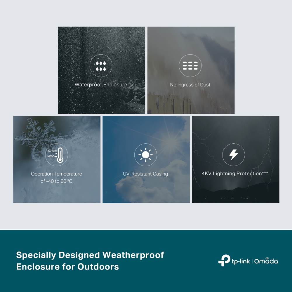 TP-Link Omada TL-SG2005-PD Weatherproof Outdoor-rated PoE-Powered 5-Port Gigabit Smart PoE Switch with 1-Port PoE++ In and 4-Port PoE+ Out – Supports Wall / Pole Mounting Key Features :- Up to 200 m PoE Distance : Standard PoE Passthrough to doubles PoE source-to-device transmission distance from 100 m (328 ft) to 200 m (656 ft) without losing gigabit speeds, perfect for long-range surveillance cameras and access points. * 1-Port Gigabit PoE++ In and 4-Port PoE+ Out : Supports up to 64 W / 44 W / 19 W/ 6 W PoE budget output when powered by 802.3bt Type 4 (90 W), 802.3bt Type 3 (60 W), 802.3at, and 802.3af PoE, respectively. ** Outdoor Weatherproof : IP55 waterproof, dustproof, and UV-resistant enclosure. Operation temperatures of -40 to 60 °C and 4KV lightning protection further ensure stable operation against harsh outdoor conditions. Easy Installation : Easy to mount to a wall or pole with the provided mounting kits to flexibly fit your needs. Centralized Cloud Management : Integrates into Omada SDN for cloud access, remote management, and multi-site management. Value-Added Features Foster Touchpoint Experiences : Static Routing, Access Control List (ACL), QoS, and VLAN. 3 years limited b2b warranty Omada PoE Technology TP-Link Omada Product-Link