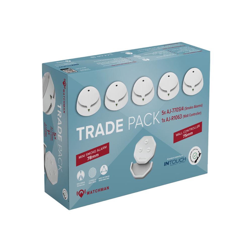 Watchman AJ-770SI4-TP – 10 Years Battery-Operated Interconnected Smoke-Alarm-Detectors Trade-Pack – NZ Building Code Compliant – Includes 5 * Smoke Detectors + 1 * Wireless Controller The AJ-770SI4, 10 Year Wireless Interconnected Smoke Alarm can connect up to 22 alarms which provides greater protection and early detection throughout the home. When one alarm activates, all other connected alarms will activate. The alarm contains cutting-edge, split-spectrum technology. Split-spectrum allows the alarm to make more accurate readings inside the sensing chamber by using two optical lights and wavelengths, and along with the additional insect mesh, helps reduce the potential of nuisance alarms caused from environmental factors. The alarm also contains a quick and automated pairing process and connects with the Watchman Wall Controller for simpler functionality. Smoke alarms are designed to be installed in bedrooms, dining rooms, living areas and hallways. The AJ-770SI4 is powered by a DC3V built-in lithium battery (non-replaceable) offering 10 years battery life. Certified to European Standards, EN14604 and complies with the NZ Building Code – NZS 4514:2021. Photoelectric Smoke Alarms should be installed in all bedrooms, lounges and hallways. Available in a Single Pack or Trade Pack of 5 alarms. Key Features :- SENSOR : Advanced Split Spectrum Senor Technology 10 YEAR LONG-LIFE: Huiderui CR123A (sealed) SOUND LEVEL: 85db at 3 meters NEW RF TECHNOLOGY: automated RF pairing, allows connection to up to 22 alarms 9 MINUTE: hush 30 DAY: low battery alert EASY INSTALLATION: with one turn ceiling mechanism CEILING OR WALL INSTALLATION: see user guides for installation locations EN14604:2005: certified, NZ Building Code and NZS 4514:2021 compliant CONNECTS with AJ-770T4 Heat Alarm, AJ-R1063 Wall Controller and the AJ-K102 Relay Switch WARRANTY 10 years